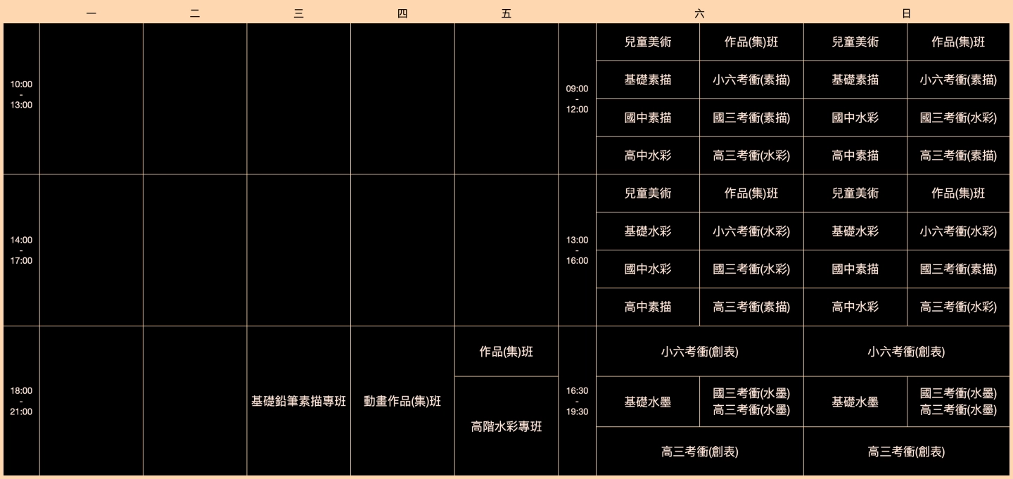 特殊天災: 若遇颱風或不可抗力因素,停課標準統一參考「人事行政局公告」。畫室將擇日安排補課,確保學習權益。